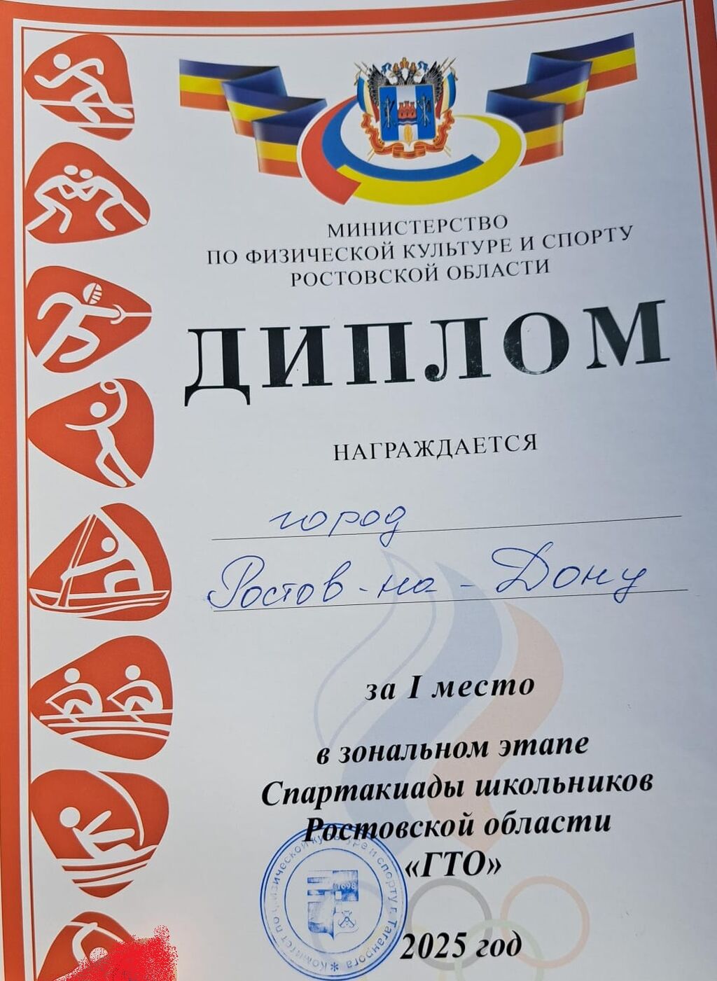 11 2025 года команда нашей школы в составе:Басараб Николая,Любомирской Дарьи,Матковской Элины,Фёдоровой Анны,Болгова Владислава,Жиленко Павла заняла 1 место в областной Спартакиаде школьников Ростовской области!В труднейшей борьбе за золотые медали ребята показали замечательные результаты в номинации ГТО ,продемонстрировали спортивный дух, сплоченность и волю к победе!Поздравляем команду и желаем новых побед!