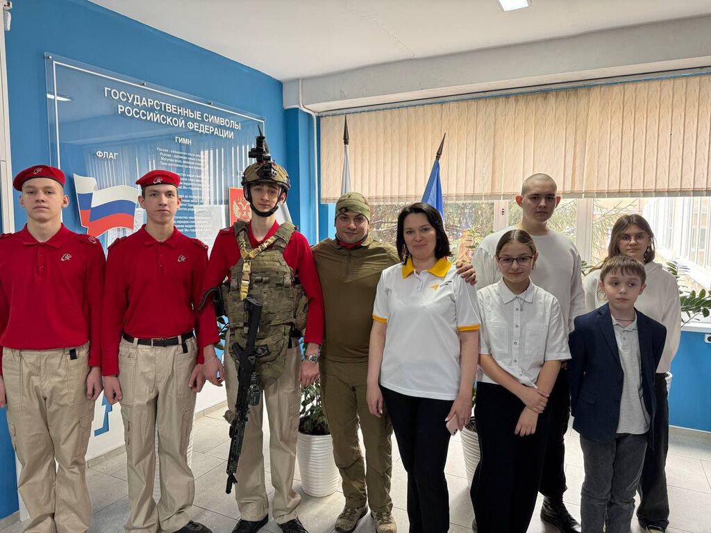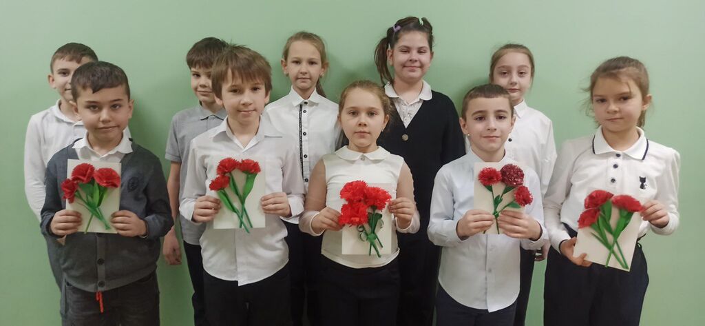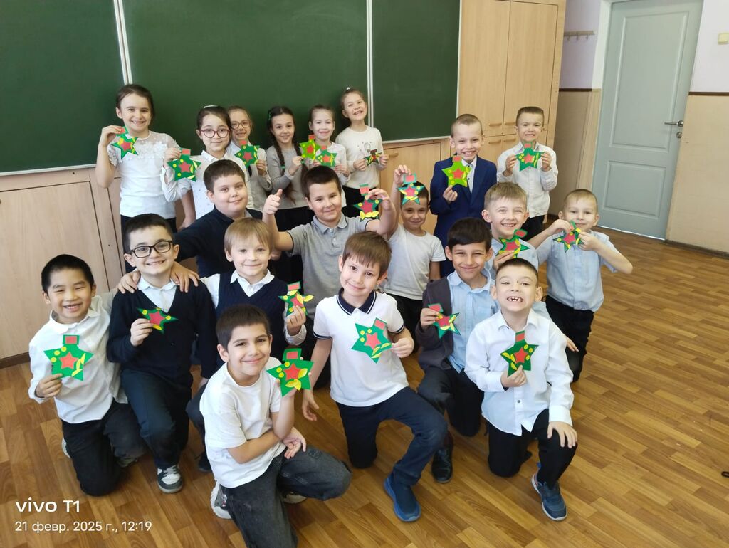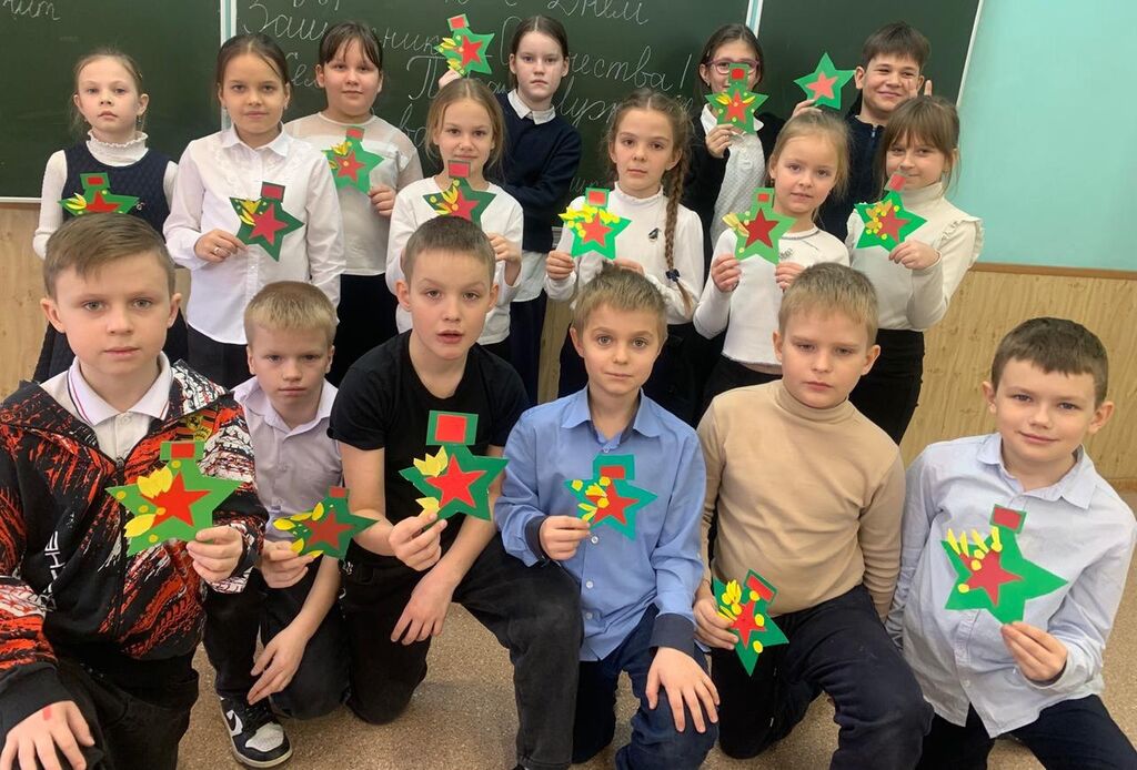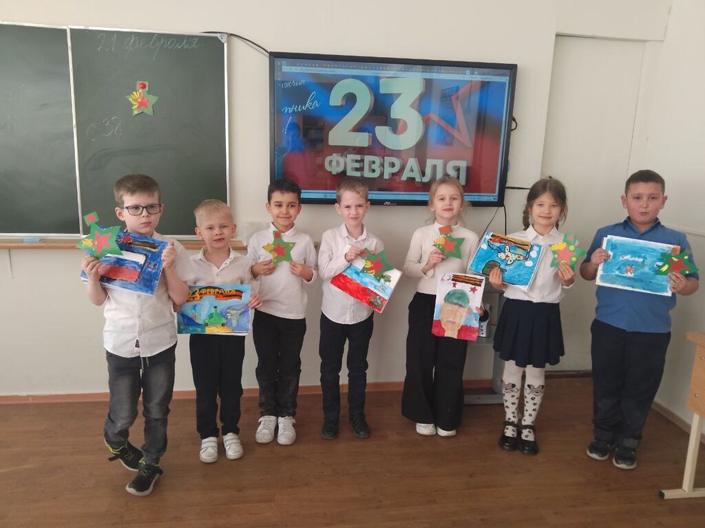 Ученики 1 класса "Б" классный руководитель Асватурьянц Г.А.,2 кл."А", классный руководитель Бездольная О.В.,3 класса "А " класный рукководитель Рочева И.А., 1 класа "А", классный руководитель Селютина О.К. тепло поздравили участников СВО с днем защитника Отечества.