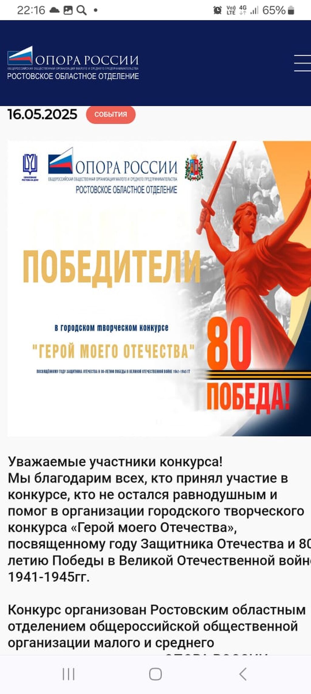 Замечательный результат учеников А.С.Ровенской. Городской конкурс,,День Победы в моей семье,, посвященный 80-летию ПОБЕДЫ,в рамках,,Года защитника Отечества,,.Германовская Александра,,8б,, и Панов Максим 11 А 3 место в городе!!!
