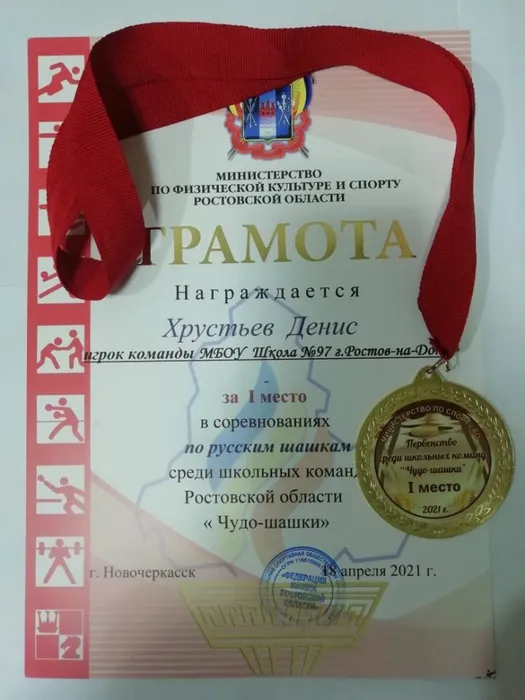 18 апреля 2021 года обучающиеся МБОУ «Школа № 97» одержали победу и заняли 1 место, в первенстве Ростовской области по русским шашкам. Соревнования проходили в городе Новочеркасск. Координаторами в проведении мероприятия выступили Бобошко Н. П. и Шаповалова О. Н. Поздравляем ребят с высокой наградой!