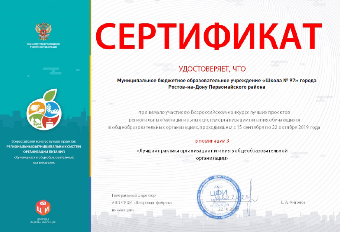 МБОУ «Школа № 97» с 15 сентября по 22 октября 2019 года приняла участие во Всероссийском конкурсе лучших проектов региональных/муниципальных систем организации питания обучающихся в общеобразовательных организациях в номинации 3 «Лучшая практика организации в общеобразовательной организации»